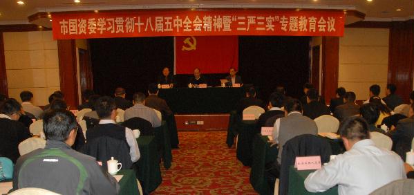 在原文传达学习十八届五中全会公报、《中国共产党纪律处分条例》,传达贯彻市委组织部〔2015〕22号文和省国资委纪检监察工作会议精神后,何锡明指出,一要践行全面从严治党新要求,严格做到廉洁自律。市国资委系统各级党委要充分认识抓好学习贯彻《中国共产党纪律处分条例》和《中国共产党廉洁自律准则》的重要意义,认真组织好学习宣传教育工作,集中一段时间加强学习教育;切实担当和落实好全面从严治党的主体责任,抓好两部党内法规的贯彻落实。二要从严从实抓好问题整改,确保专题教育取得实效。强化问题意识,着力查找和解决不严不实突出问题,把专题教育查找出的不严不实问题,教育实践活动尚未整改的“四风”问题,市纪委巡查反馈的问题,一并纳入整改内容。严格落实责任,大力弘扬严和实的精神。各级党委要认真履行主体责任,主要负责人要认真履行第一责任人的责任;领导班子成员要坚持“一岗双责”,抓好分管领域的专题教育;组织部门要履行好牵头责任,把每个关键动作抓到位。坚持两手抓、两促进,把专题教育成效体现在促进市管企业改革发展上,以国资监管的新成果、国企改革发展的新突破,来检验专题教育成效,履行好国有资产保值增值责任。三要深入推进国有企业各项改革,确保实现持续健康发展。济宁市国资委系统要把学习宣传贯彻十八届五中全会精神,作为当前和今后一个时期的重大政治任务,与学习贯彻十八大和十八届三中、四中全会精神结合起来,切实把思想和认识高度统一到中央和省市委要求上来,把力量凝聚到推动深化国资国企改革发展各项任务上来。指导企业深入贯彻十八届五中全会精神,精心谋划“十三五”发展规划。建立健全规划执行体系,把五年规划与年度经营目标有机衔接,并严加考核、确保落地。深刻领会中央省深化国资国企改革思路,大力推动我市国资国企改革工作。当前,要抓好加快发展混合所有制经济、健全完善现代企业制度、深化企业内部改革、发挥企业党组织的政治核心作用等几项重点改革工作。切实抓好经济运行工作,确保顺利完成年度经营目标。企业各级领导人员要自觉把完成目标任务作为检验个人党性觉悟、责任担当、工作能力的重大考验,层层压实经营目标完成责任,坚决不让考核指标在自己这里落空。严格落实安全生产责任,坚决杜绝重特大安全事故发生,维护企业生产秩序稳定。认真做好今年工作总结,打开思路谋划明年工作安排,提出创新性、突破性的国资国企改革发展目标,推动工作迈上新的台阶。要进一步加快转变干部作风,提升国资监管服务效能,为推进市管企业改革发展提供有效保障。