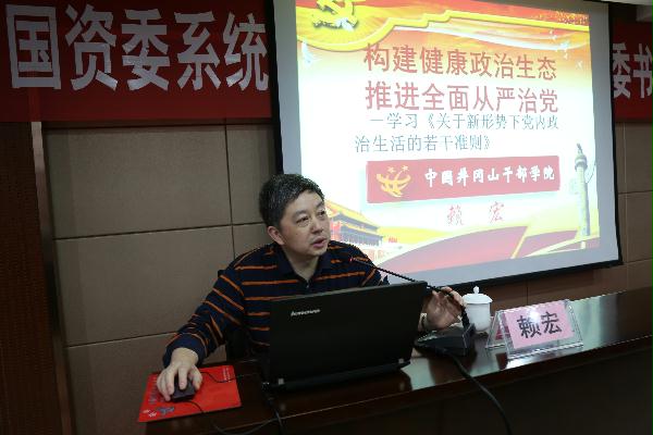 中国井冈山干部学院教学科研部党建教学研究中心主任赖宏作了《构建健康政治生态,推进全面从严治党—学习<关于新形势下党内政治生活的若干准则>》的专题报告,赖主任从深刻认识全面从严治党的重大意义、党内政治生活的基本遵循、全面从严治党永远在路上三个方面对《准则》的内容进行了深刻解读。