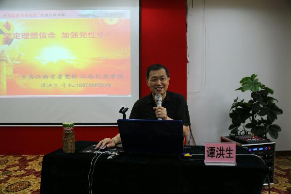 江西省委党校原副巡视员谭洪生作了《坚定理想信念,加强党性修养》的专题报告。谭教授从坚持共产党人的理想信念、加强党性修养等方面进行了讲解,阐述了坚持理想信念是永恒的课题,补好精神之“钙”是一项长期的任务以及加强党性修养是坚持理想信念的必由之路,必须长期坚持,一以贯之。