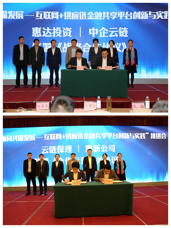 会上,双方共同见证了中企云链与济宁市惠达投资有限公司签订《战略合作协议》、云链保理与济宁市惠新民间融资登记服务有限公司签订《合作运营服务协议》。合作协议的签订,标志着惠达投资将加入中企云链供应链金融服务平台,与平台上的大型央企、银行实现信息、资源互通。同时也将进一步丰富中企云链项目资源库,扩大覆盖面,实现双方合作互惠,良性发展。