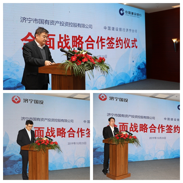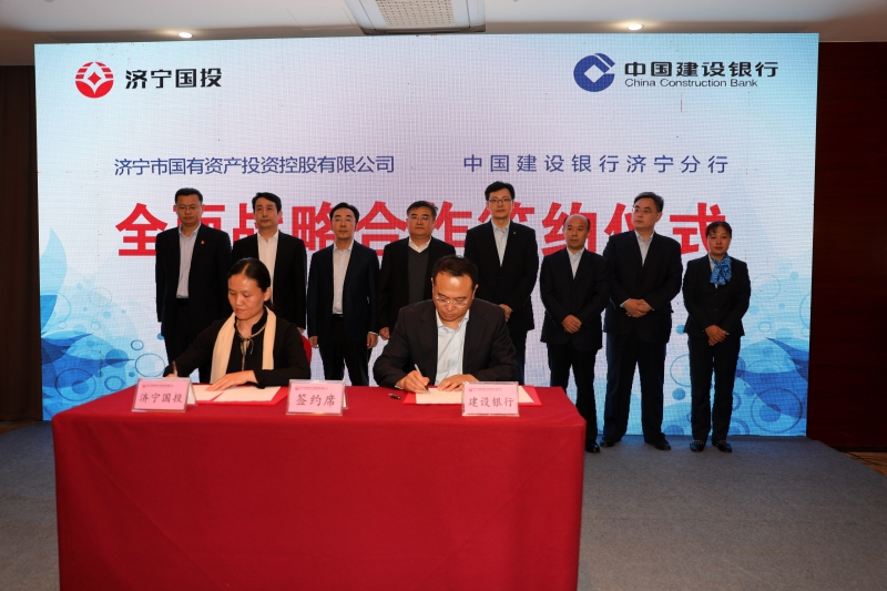 10月23日下午,济宁市国有资产投资控股有限公司与中国建设银行济宁分行全面战略合作签约仪式成功举行。建行济宁分行党委书记、行长袁雪峰,市国资委党委书记、主任丰家雷,济宁国投党委书记、董事长虢洪增参加活动并致辞。济宁国投党委副书记、工会主席马振主持。