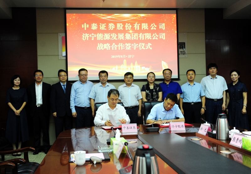 8月15日上午,济宁能源发展集团与中泰证券股份有限公司(简称:中泰证券)战略合作签字仪式在济宁能源大厦举行。中泰证券党委副书记、总裁毕玉国,市国资委党委书记、主任丰家雷,济宁能源党委副书记、总经理张广宇参加签字仪式。