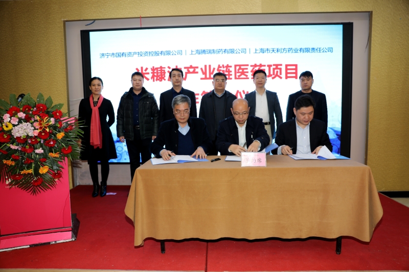 1月6日下午,济宁国投与上海腾瑞制药、上海市天利方药业——米糠油产业链医药项目合作签约仪式圆满举行。市国资委党委书记、主任丰家雷、济宁国投党委书记、董事长虢洪增、上海腾瑞制药有限公司董事长兼总经理叶桃参加活动并致辞。济宁国投党委委员、副总经理吴金素主持仪式。