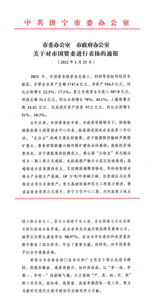 喜报!济宁市国资委获市委、市政府通报表扬