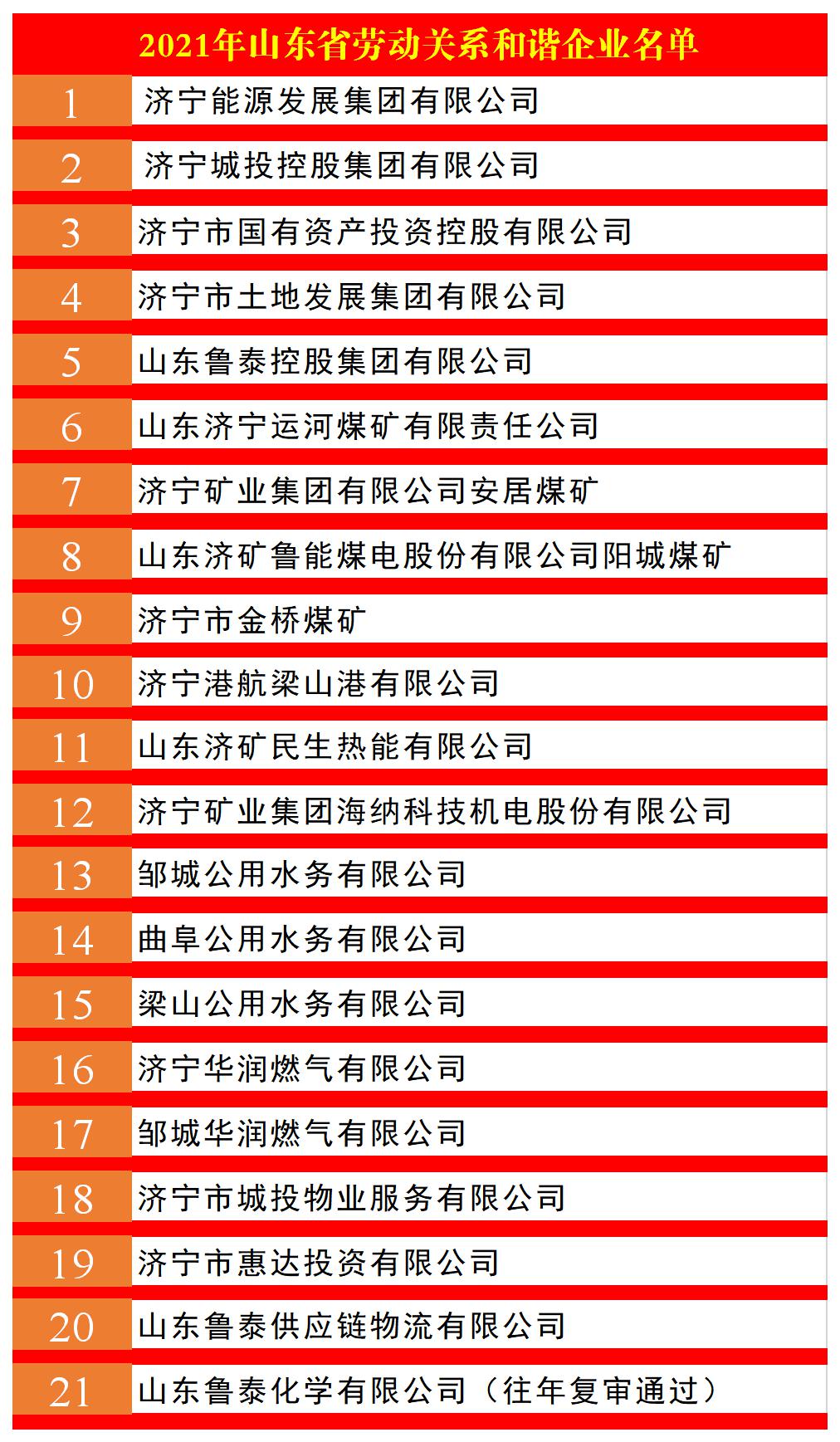 7月6日,省人社厅、省总工会、省企业联合会、省工商联联合公布了2021年山东省劳动关系和谐企业名单,济宁市共78家企业入选,其中,济宁市国资系统共有21家入选,上榜数量创历史新高!