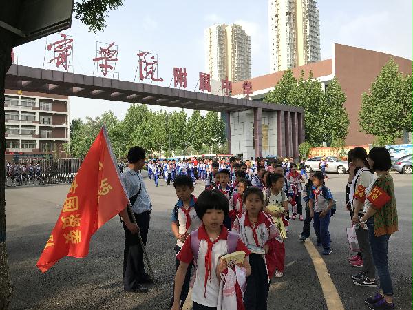 (志愿者在济宁学院附属中学丰泰校区门口引导学生文明出行)